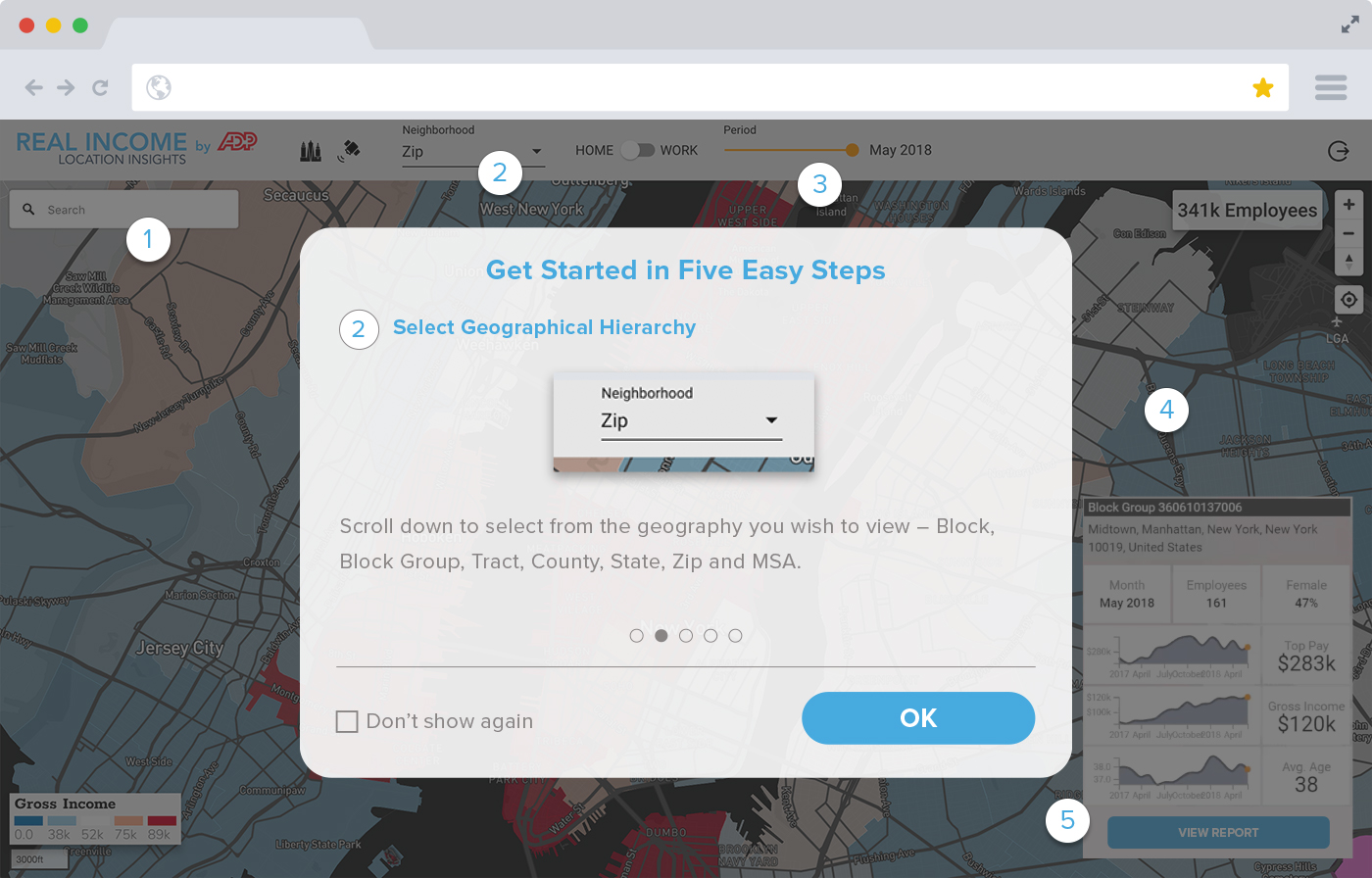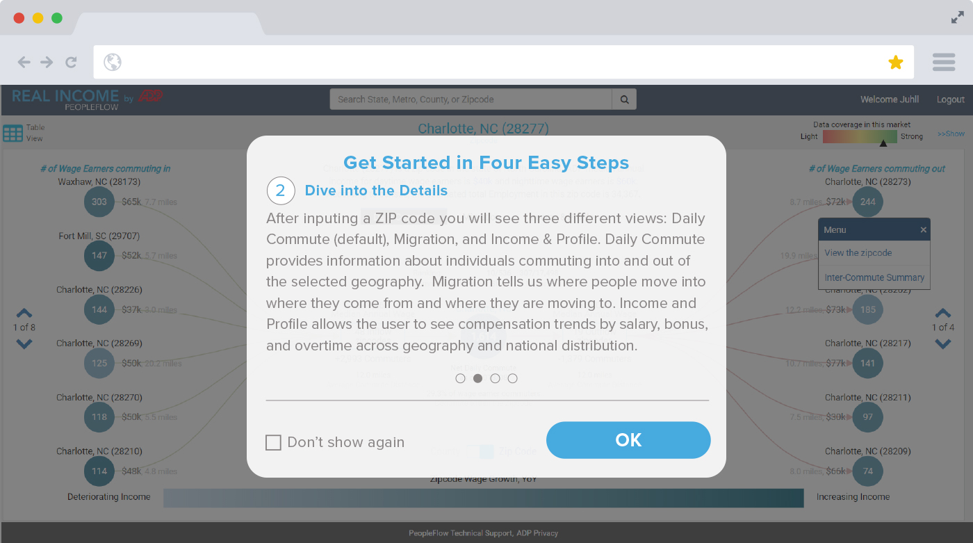 The portal experience is an adaptive web-based experience that allows users to find income data, gain geo-location insights, as well as employee migration data.