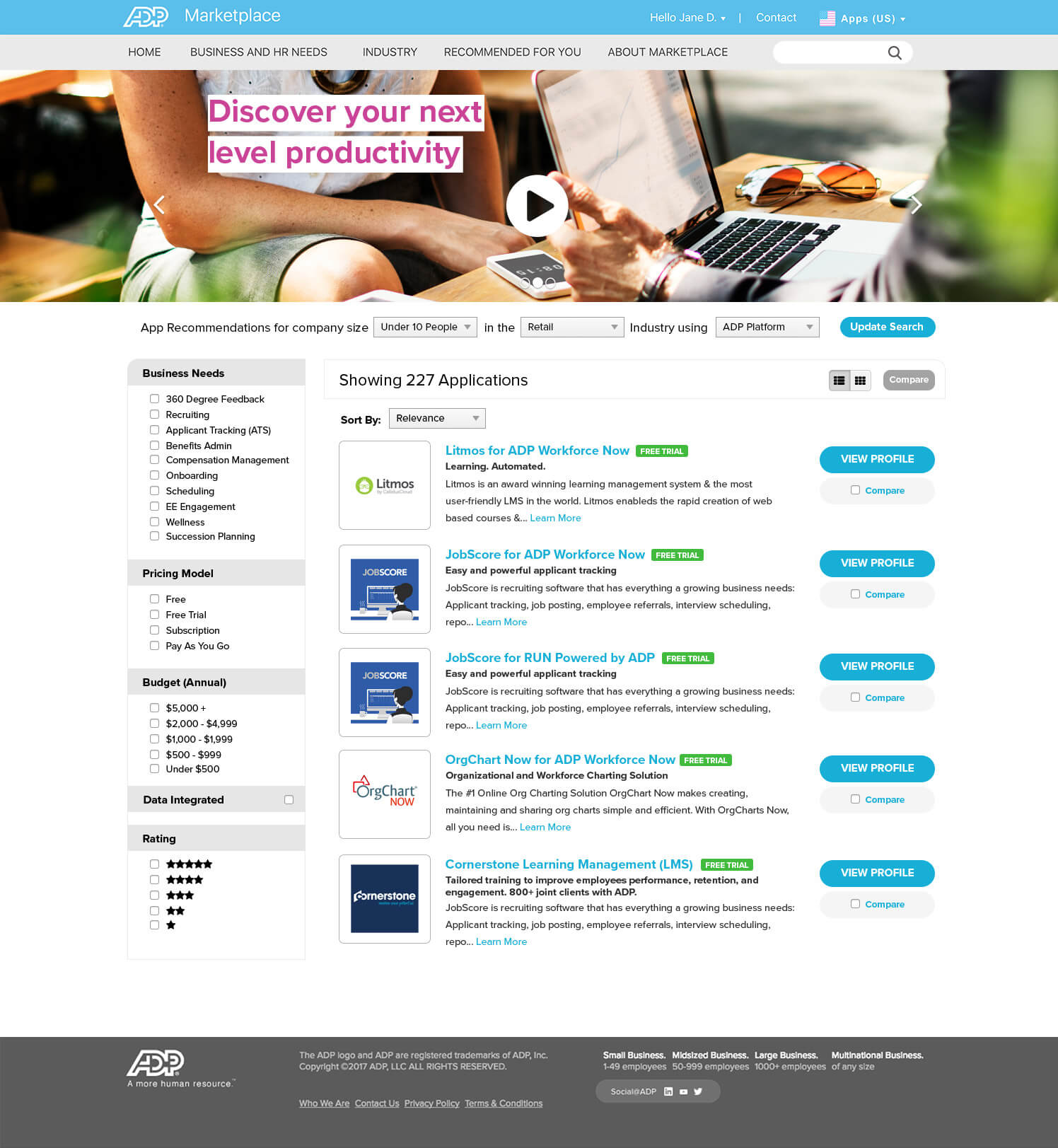 The ADP Appstore is a marketplace of 200+ apps available to over 600,000+ ADP clients. The apps offered fall into the following categories: find new talent, onboarding, time & expense, develop & reward, process payroll, provide benefits and run my business. The main objectives of the Appstore are to increase free trials, sales and leads.
